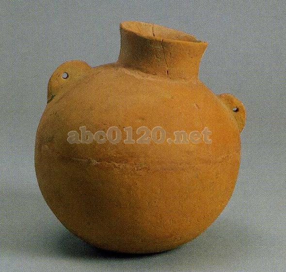 泥質の紅色の土器。手びねりで成形され、口は小さく、頸は高い。球状の胴部で、小さな平底をなす。肩部に2個の対称の半月形の竪耳が付き、それぞれ1円孔がある。 出所:「中国の考古学展-北京大学サックラー考古芸術博物館所蔵」