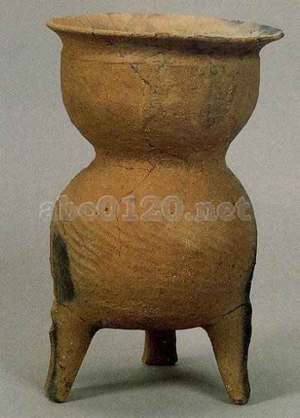 砂質の紅色土器で、手びねりで成形されている。下部は口縁が外反する盆の形で、下部は鼎形をなし、丸い胴部の下に平たい鑿形の足が付く。器表には粗い籃文が浅く付けられている。大汶口文化の土器群の晩期に新たに出現する炊事具である。 出所:「中国の考古学展-北京大学サックラー考古芸術博物館所蔵」