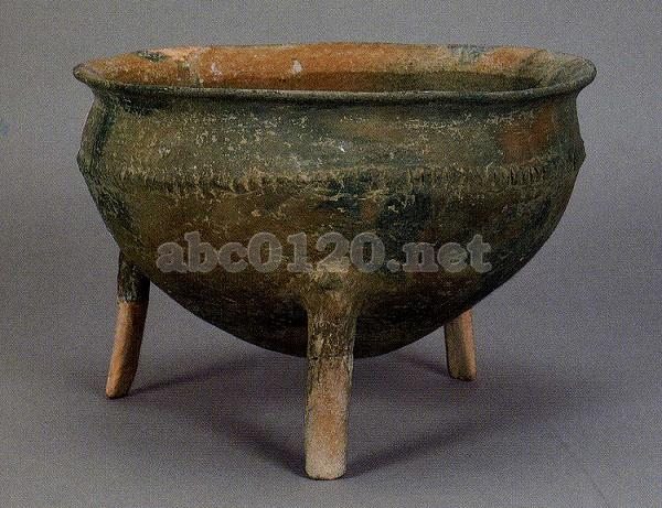 砂質の紅褐色土器。手びねり成形。口唇は丸く、斜めに立ち上がっている。丸い胴部はかなり深く、丸底の盆形を呈する。下に扁平な鑿形の3足が付き、付け根に突起がある。器壁の上部には横方向に鎖状の凸帯が一周している。 出所:「中国の考古学展-北京大学サックラー考古芸術博物館所蔵」