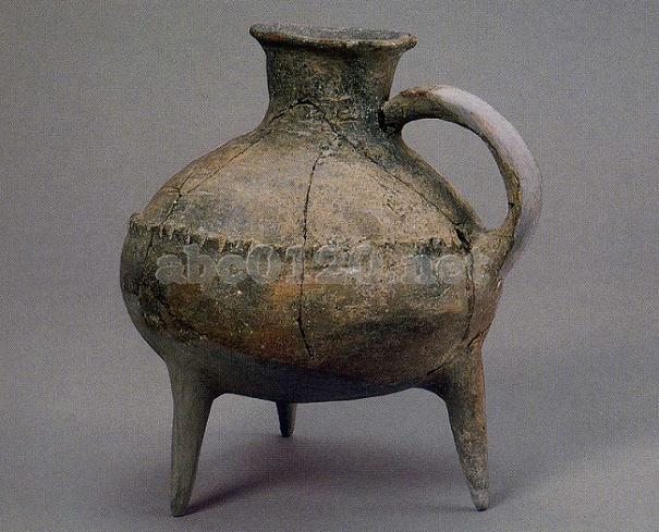 砂と滑石粉の入った灰褐色土器。手びねり成形。口唇は丸く、口縁は外反するが、流は無い。頸部と胴部は明確に分かれており、胴部はやや扁形の球で、平底、3本の円錐状のかなり短い足がある。胴部に輪状の把手が付く。胴部の中位に横方向に鎖状の凸帯が一周している。 出所:「中国の考古学展-北京大学サックラー考古芸術博物館所蔵」