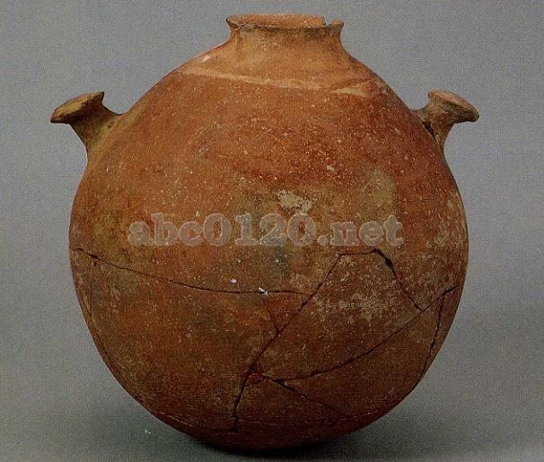 細かい砂と真珠貝の殻粉の入った紅色土器。手びねり成形。口唇部は薄く尖り、口縁は外反し、頸は短く、撫で肩で、長くて丸い胴部をもち、小さい平底となる。上部に2個のほぼ対称の茸状の把手が付き、肩の上部の1個所に円孔が穿たれている。全体に紅色の化粧土が施されている。 出所:「中国の考古学展-北京大学サックラー考古芸術博物館所蔵」
