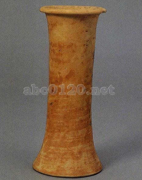 きめの細かい泥質紅色土器。手びねり成形。口唇が丸く、腰部がしぼられ、器口と底はラッパ形を呈する。器表は紅色の化粧土が施されているが、多くが剥落している。 出所:「中国の考古学展-北京大学サックラー考古芸術博物館所蔵」