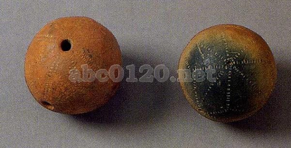泥質紅色土器で、いずれも外表に箆点文が刻まれており、内部に小陶粒あるいは砂を入れている。左は外壁に6個の円孔があるが、右には無い。 出所:「中国の考古学展-北京大学サックラー考古芸術博物館所蔵」