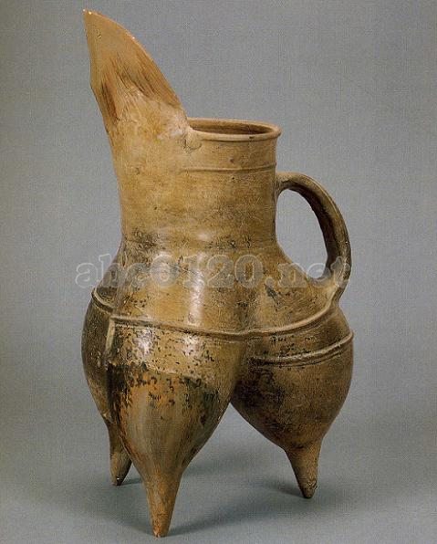 泥質の黄褐色土器。手びねり成形。天を衝く長い流があり、頸は太く、頸と胴は明確に分かれていない。1本の把手で、袋足下は円錐状の中の詰まった足となっている。器表は磨かれて光沢がある。凸弦文と乳釘文の装飾がある。 出所:「中国の考古学展-北京大学サックラー考古芸術博物館所蔵」