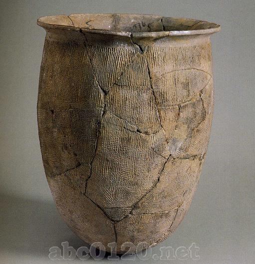砂質の灰色土器で、手びねり成形。口縁は外反して口唇は角張っており、深腹円底で、胴上部の縄文は垂直、下部の縄文は交錯している。器表は泥を塗った後、炊器として用いている。二里頭文化の典型的器物で、数量はかなり多い。 出所:「中国の考古学展-北京大学サックラー考古芸術博物館所蔵」