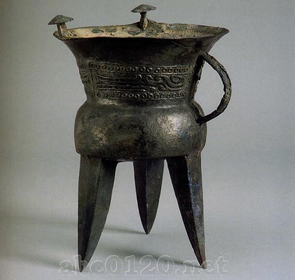 口縁が外反し、頸と胴との境界が明確で、底部はやや凸である。2本の茸状の柱、3本の空洞の足、1鋬である。器壁はかなり薄く、頸部に夔文が一周し、夔文の上下にはそれぞれ連珠文が周っている。 出所:「中国の考古学展-北京大学サックラー考古芸術博物館所蔵」