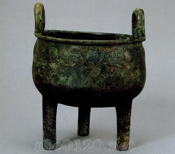 口縁は巻状で口縁端部の断面は円形。口縁には2つの耳があり、底には円柱状の脚が付く。頸部には折身の夔文を周らせ、間には円渦文を飾る。器底にはススの痕跡があり、脚部には3箇所、鋳かけ直しをした痕がある。文様の磨滅はかなり著しく、はっきりしない。出所:「中国の考古学展-北京大学サックラー考古芸術博物館所蔵」