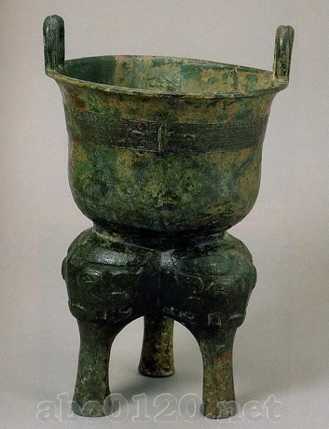 甑と鬲が合体して器をなす。口縁には索状の耳が付く。器の底には(竹+畀)〔スノコ〕があり、獣面形の透しが施されている。(竹+畀)と甑の壁とは紐状の環で連接されている。鬲の底部には円柱状の脚が3本付き、脚外側には牛首文が飾られている。頸部には3列に獣面文が飾られる。(竹+畀)と胴部にはススの痕跡がある。出所:「中国の考古学展-北京大学サックラー考古芸術博物館所蔵」