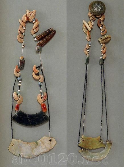 石製の獣首、大小の玉・石の蚕、珠と2件の玉磺からなる。乳黄色の玉磺は両面に陰刻で夔文が刻されている。長さ約4.5cm。黒緑色の玉蓑は素文。長さ3.5cm。