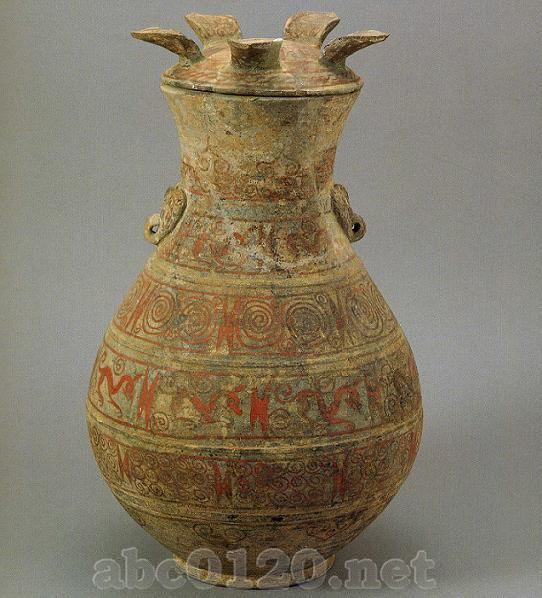 泥質灰色上器。球面状の蓋があり、蓋上には五つの蓮弁状の鈕〔つまみ〕が付いている。器身は楕円形で、器腹はふくらんでおり、高台が付く。本体には朱紅色の彩色文様が、蓋には巻雲文が、それぞれ施されている。器身の文様は6層に分かれており、巻雲文・龍文・渦巻文およびハート形雲文が見られる。出所:「中国の考古学展-北京大学サックラー考古芸術博物館所蔵」