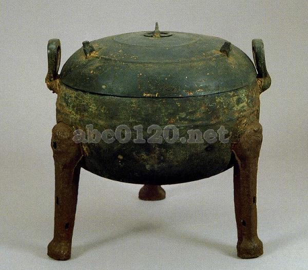 青銅製。覆鉢形の蓋があり、蓋上には三つの環状の鈕が付いている。器身は扁円形で、双耳が付く。鉄を鋳造した丈の高い獣足3本が付く。無文。出所:「中国の考古学展-北京大学サックラー考古芸術博物館所蔵」