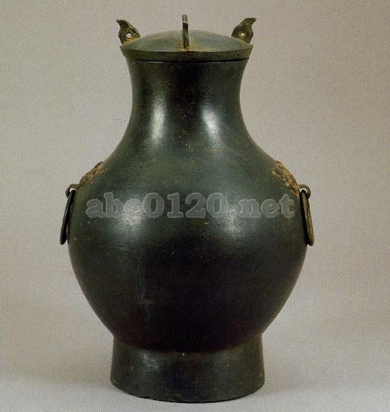 青銅製。浅い覆鉢形の蓋があり、蓋上には環状の鈕か4つ付いている。 器身は楕円形で、器腹はふくらんでおり、圏足が付く。肩部には2つの鋪首に環耳があしらわれている。無文。出所:「中国の考古学展-北京大学サックラー考古芸術博物館所蔵」