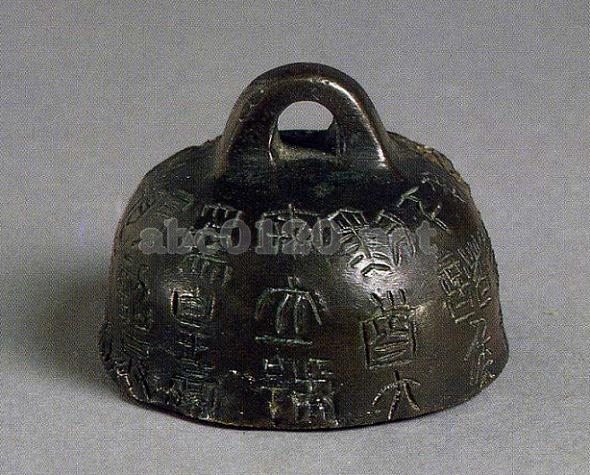 衡器〔はかり〕。青銅製。橋形の鈕があり、器身は半球形である。器身上には秦始皇26年の度量衡統一の詔についての次のような篆刻銘が見られる。「廿六年、皇帝尽并兼天下、持首大安、立号為皇帝。乃詔丞相状・綰、法度量、則不壹、歉疑者皆明壹之。出所:「中国の考古学展-北京大学サックラー考古芸術博物館所蔵」
