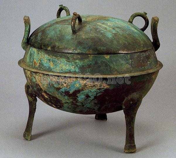 西漢(206B.C~8A.D.) 出土地不明 高27.0cm、胴径28.3cm 青銅製。覆鉢形の蓋があり、蓋上には3つの環鈕があしらわれており、耳が付く。器腹は扁円形を成し、平らなヘりが出ている。 3本の獣足がある。無文。出所:「中国の考古学展-北京大学サックラー考古芸術博物館所蔵」