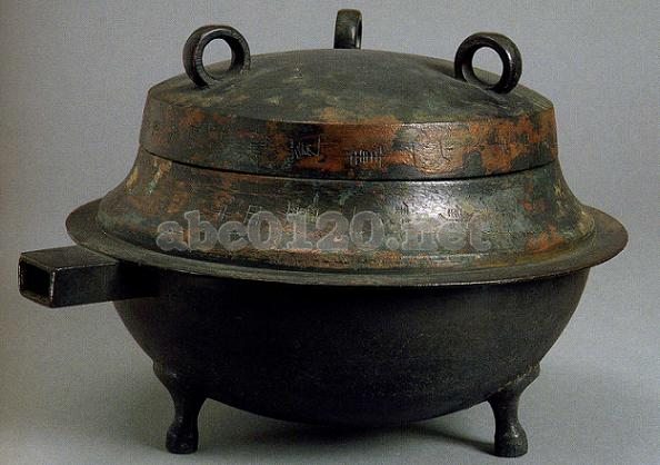 青銅製。盤形の蓋があり、蓋上は三つの環鈕で飾られている。器身は扁円形で、口縁部はすぼまっている。器腹には平らなへりが出ており、側には中空の把手が一つあるが、これは木の柄を取り付けるためのものであろうか。耳が付けられている。器底には3本の丈の低い獣足がある。蓋および器身にはいずれも隷書の刻銘がある。蓋銘「陽信家銅銗鏤蓋重一斤八両四年第六」、器身銘「銅銗鏤一重四斤八両」。出所:「中国の考古学展-北京大学サックラー考古芸術博物館所蔵」