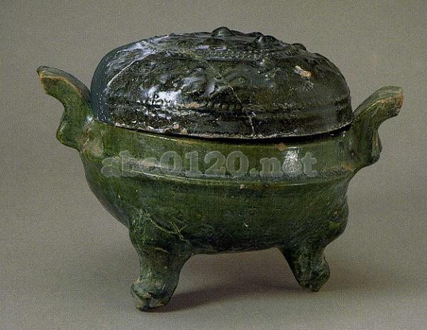 東漢(25~220) 陝西省咸陽市竇店M5出土 高17.0cm、径(耳部)21.0cm 泥質紅陶。覆鉢形の蓋があり、外側に反った大きな耳が付く。鼎の器腹は扁円形で、文の低い3本の獣足が見られる。全体に緑釉がかけられている。出所:「中国の考古学展-北京大学サックラー考古芸術博物館所蔵」