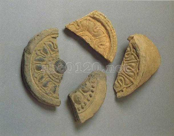 胎は灰白あるいは黒灰色。複式蓮花文の瓦当片3件は、文様が明らかに異なる。単弁の蓮花文瓦当は、外周が蓮弁文である。北魏晩期から東魏、北斉時代の蓮花瓦当の文様の特徴を示している。出所:「中国の考古学展-北京大学サックラー考古芸術博物館所蔵」