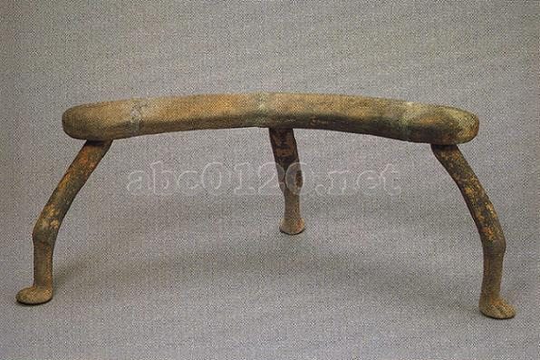 泥質の灰陶で、漆器の脇息の形を模した明器である。脇息面と3足から成る。脇息面の上面は孤形を呈し、表面は凸起している。底部は内凹し、3足を挿入する孔がある。3足はいずれも獣足をなす。出所:「中国の考古学展-北京大学サックラー考古芸術博物館所蔵」