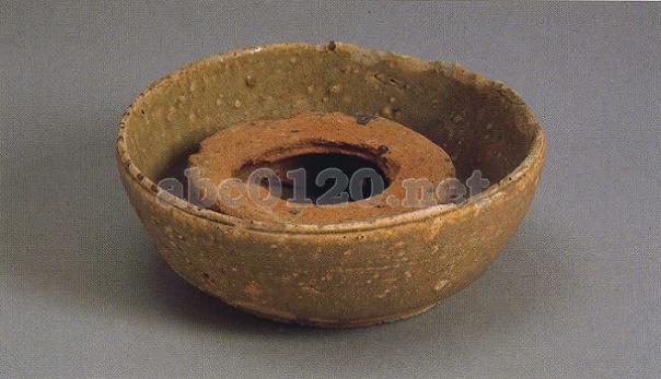 口縁部は少し欠けているが、復元可能。口はすぼまり、曲線的な器腹はかなり深く、内底の削られていない高台である。灰色胎に、青釉が内は全面に外は胴下部まで施されている。釉面は光沢ある。口縁部外側に凹弦文が周っており、口縁には褐色の点彩がある。器内は鋸歯形のハマが熔着している。出所:「中国の考古学展-北京大学サックラー考古芸術博物館所蔵」