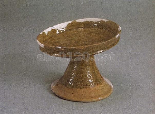 変形しており、口縁と底部は少し破損している。口が広く、器腹は浅く、ラッパ形の高脚が付く。灰色胎。深い青色釉が内は全面に外は高台下部まで施されている。釉面は透明感があって光沢をもち、細かい貫入がある。見込の中心部に一重の圏文がある。出所:「中国の考古学展-北京大学サックラー考古芸術博物館所蔵」