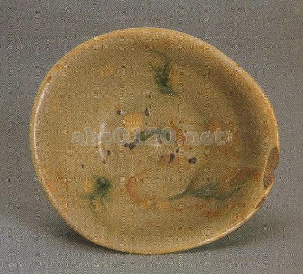 口縁部は先が薄く、器壁は弓なりをなし、器底近くですぼまっている。丈の低い高台が付く。釉は青灰色を呈し、光沢がある。内壁には緑彩で二つの藍草文が描かれている。焼成の過程で口縁部に変形が生じている。出所:「中国の考古学展-北京大学サックラー考古芸術博物館所蔵」