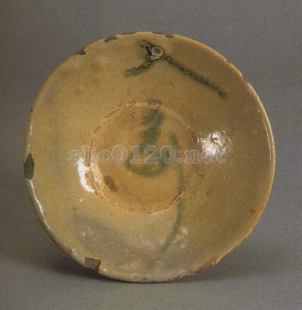 口縁部は丸く、器壁はまっすぐ広がり、器腹は浅い。丈の低い高台が付く。釉は淡い青色を呈し、釉層は比較的薄く、釉中には気泡が見られる。内壁および見込には緑彩で「大吉利」の3字を書く。見込には重ね焼きした際の痕跡が1周している。出所:「中国の考古学展-北京大学サックラー考古芸術博物館所蔵」