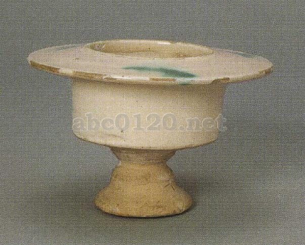 幅広い平縁、胴部は扁平で、器壁は斜めにすぼまり、小さな台形の脚が付く。乳白色釉は、細かい貫入があり、半ば光沢がない。平縁面には3片の翠緑彩斑がある。白釉緑彩は銅を呈色料とする高温彩で、晩唐・五代の長沙窯で創始されたもので、北宋時期には北方の多くの窯場で流行した。最もよく見られるのは、器物の口縁あるいは胴部に3片の彩斑を付け、簡単な散草文を少量描いている。出所:「中国の考古学展-北京大学サックラー考古芸術博物館所蔵」