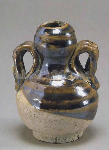 瓢箪形で、2本の泥紐形の双耳に、器腹が張り、玉環形の高台が付く。柚釉は棕黄で、器全体で袖釉色が均―ではないが、光沢があり、施釉は胴下部に至っている。この種の器物は、第二期前段の地層からの出土がかなり多い。出所:「中国の考古学展-北京大学サックラー考古芸術博物館所蔵」