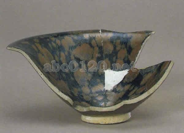 口唇は丸く、口縁は外反し、器壁は斜めで湾曲しており、小さな高台は中がほとんど削り込まれていない。内面は黒釉、外面は褐釉で、光沢があり、施釉は高台際に至っている。内面には不規則な棕紅色の鷓鴣斑がある。この種の器物の素地は白く、きめは細かく、器壁はかなり薄く、成形は端正で、定窯に倣った製品である。出所:「中国の考古学展-北京大学サックラー考古芸術博物館所蔵」