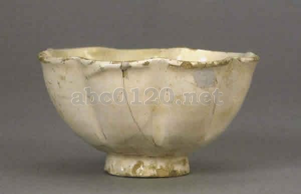 7弁の花形で、口唇は丸く、口縁は外反している。器腹は湾曲し、高台は外に開いている。粉白釉で、きわめて細かい貫入があり、光沢があってみずみずしく、施釉は高台に至っている。出所:「中国の考古学展-北京大学サックラー考古芸術博物館所蔵」