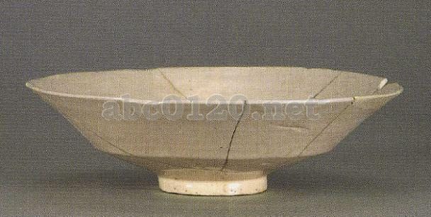 6輪花で、口唇は丸く、胴部で屈折し、玉環形の高台が付く。白釉は青灰色味を帯び、化粧土は施されていない。長い線状の貫入があるが、光沢があり、畳付の釉は削り取っている。輪花に相対する器壁に浅い型押しの瓜稜がある。この種の輪花と瓜稜を配した装飾は、倣定器の中で最もよく見られるものである。出所:「中国の考古学展-北京大学サックラー考古芸術博物館所蔵」