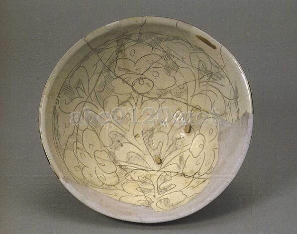 口唇は尖り、口縁が外反し、器壁は斜めで湾曲し、高台は外に開いている。外面は黒釉で、きわめて細かい棕眼〔気泡の抜けた孔〕があるが、光沢がある。畳付の釉は削り取っている。内面は卵白釉で、光沢は鈍い。劃花の折校牲丹文で、櫛で地文を作っている。櫛描き地の劃花装飾は、第二期前段より出現し、たちまち磁州窯で最も流行した装飾技法となった。この器の見込には3枚の縦向きの目痕がある。これは別々の三角形の小さな目を置いて焼成した痕跡である。この種の焼成方法は、二期前段に出現し、第四期前段に消失するもので、重要な時代的特徴である。出所:「中国の考古学展-北京大学サックラー考古芸術博物館所蔵」