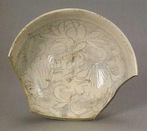 肥った口唇で、口縁は外反し、器壁は湾曲し、玉環形の高台が付く。白釉は青灰色がかり、小さな貫入があるが、光沢があってみずみずしい。施釉は底部に至っていない。劃花の蓮花唐草文は、2蓮花、2荷葉である。この種の文様は、この期の碗で最も流行した装飾である。出所:「中国の考古学展-北京大学サックラー考古芸術博物館所蔵」