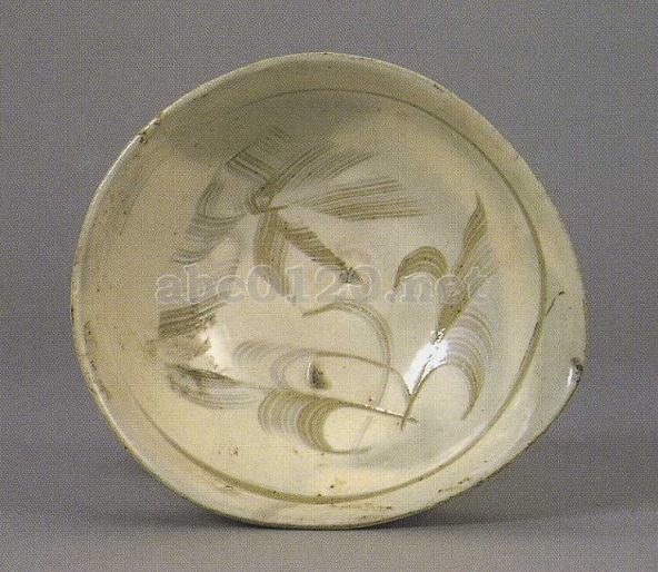 口唇が丸く、口縁は開き、器壁は湾出して、小さい高台が付く。白釉は灰色がかり、光沢がある。櫛の類の工具で折枝蓮文を劃いている。出所:「中国の考古学展-北京大学サックラー考古芸術博物館所蔵」
