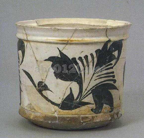 口唇が丸く、口縁は外反し、口縁下に1本の凸稜が周り、内面には1本の台稜が廻る。器腹は深く、直壁で、底部近くで屈折し、ごく浅い高台が付く。褐黒色で、 1株の草葉文を描く。この種の盒には蓋があったはずであり、磁州窯の典型的器物である。白地黒花の装飾は、磁州窯の最も典型的で最も豊富な特徴的装飾で、第二期後段に出現し、その後最も流行した装飾技法の一つである。出所:「中国の考古学展-北京大学サックラー考古芸術博物館所蔵」