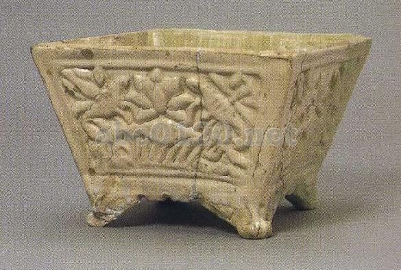 方形で、口縁は開き、直壁である。底部に4個の雲状の三角形の足がある。卵白釉で、光沢がある。印花荷塘文である。この器物は、文様の型で成形しており、成形と印花は1度に完成している。器物の成形後に文様型を用いた印花装飾とは異なるものである。この種の装飾は第三期にかなり流行した。出所:「中国の考古学展-北京大学サックラー考古芸術博物館所蔵」