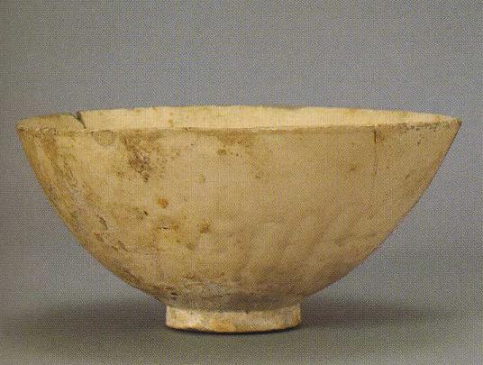 口唇が丸く、口縁は開き、器壁は湾曲して、高台がやや外に開き、足が小さく上体が大きい。白釉は黄色がかり、光沢が無い。施釉は高台に至っている。見込に数個の石英砂のかたまりの痕跡がある。これはこの段階から新たに出現する窯詰方法で、重ね焼きの器物の間に石英砂を積んで間隔をとっている。これは陶磁器制作を急いだことを示している。出所:「中国の考古学展-北京大学サックラー考古芸術博物館所蔵」