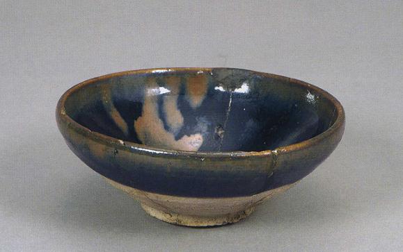 口唇が丸く、口縁はすぼまり、器壁は斜めで湾曲している。低い高台が付き、内底は削って斜めになり、旋回の中心が突起している。漆黒色釉で、きわめて小さな棕眼、褐紅色の購t烏鷓鴣斑がある。鷓鴣斑は斑花の彩料を黒釉の上に撒いて形成する。この種の黒釉鷓鴣斑文碗は、観台窯第四期後段の最も大量に生産された製品であり、漏斗形の匝鉢で一つ一つ焼成された。出所:「中国の考古学展-北京大学サックラー考古芸術博物館所蔵」