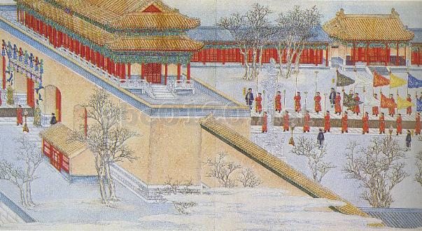 「冊立奉迎図」(10)は、太和門、内金水橋をへて正門である午門(五鳳楼)をでて、皇后を奉迎にむかう使者とその一行。正・副使が先頭をすすみ、宝冊、宝印の龍亭、皇后の鳳輿(喜轎ともいう)がつづきその後に内大臣、侍衛の儀杖隊がみえる。鳳輿の中には皇帝がしるした「龍」1字と金造の如意がおさめられている。出所:北京「故宮博物院展・紫禁城の宮廷芸術」1985-85