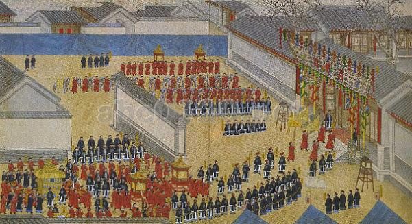 「冊立奉迎図」(15)は、皇帝の使者をむかえる当日の皇后邸も、大婚のための飾りがなされ、準備がととのえられている。邸内の正堂の中央に節案、左右に冊案と宝案が設置され香が焚かれている。正・副2人の使者は、礼服に身を正した皇后の父とその兄弟たちが門外に跪いて迎えるなかを邸内にすすむ。出所:北京「故宮博物院展・紫禁城の宮廷芸術」1985-85