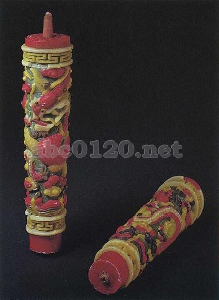 五彩雲龍文蜡燭は、宝珠にたわむれる龍を浮文であらわしている。皇帝の大婚や祝祭日につかわれたものである。出所:北京「故宮博物院展・紫禁城の宮廷芸術」1985-85