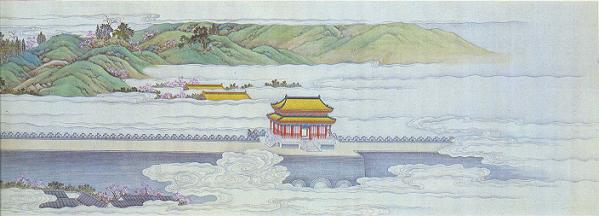 画巻(1)は、巻頭が紫禁城北門である神武門から京城の西門のひとつ西直門へと、辿った行程をさかのぼる形式ではじまる。図は神武門と景山である。出所:北京「故宮博物院展・紫禁城の宮廷芸術」1985-85