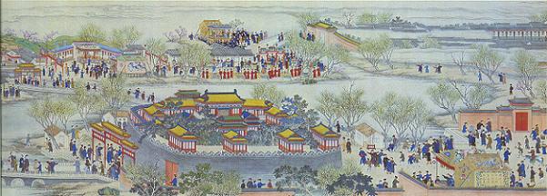 画巻(3)は、北海と団城、禁苑として、皇帝の遊楽の場所である北海と団城の当日の風景である。このあたりは八期軍のうち正白、鑲黄2旗が沿道の飾りつけにあたった。金鰲玉蝶蝀、白塔がみえる。出所:北京「故宮博物院展・紫禁城の宮廷芸術」1985-85