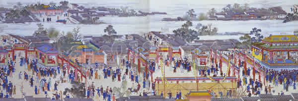 皇帝の一行をまつ沿道は、大屋台、牌門、さまざまな演芸や劇を催している戯台、楼閣が軒をならべ、これを見物する官員や市民たちで雑踏している。各種の万寿節の飾り屋台の他に一般の店舗や民家もみえる。沿道の飾りは、各官署が分担してうけもち趣向をこらしたのであったが、どの屋台にも共通していたのは、皇帝の長寿を祝う萬寿経を誦したことである。出所:北京「故宮博物院展・紫禁城の宮廷芸術」1985-85
