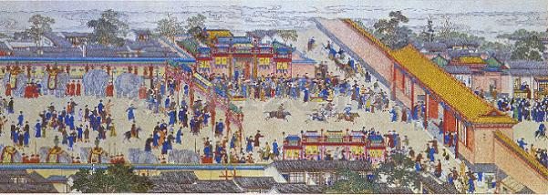 皇帝の一行をまつ沿道は、大屋台、牌門、さまざまな演芸や劇を催している戯台、楼閣が軒をならべ、これを見物する官員や市民たちで雑踏している。各種の万寿節の飾り屋台の他に一般の店舗や民家もみえる。沿道の飾りは、各官署が分担してうけもち趣向をこらしたのであったが、どの屋台にも共通していたのは、皇帝の長寿を祝う萬寿経を誦したことである。出所:北京「故宮博物院展・紫禁城の宮廷芸術」1985-85