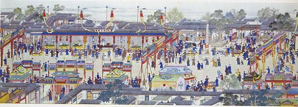 屋台、牌門、戯台は限りなくつづく。また独特の書斎飾り、めでたい菓子や食物の飾盛、珍しい灯籠や幟、皇帝の徳を大書した看板などもあらわれる。賑やかな表通りの雑踏のなかにも一般の家々では平生と変わらない生活がくりひろげられている。牌門や屋台には、めでたい語句が記されている。皇帝―行の到着はちかい。出所:北京「故宮博物院展・紫禁城の宮廷芸術」1985-85