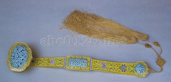 如意の頭部、中部、尾部の三カ所にみえる松石緑釉を使った透し彫りの飾りは、松柏、盤長、蝙幅で、この四つで譜音による「福寿年長」をあらわす吉祥図案である。