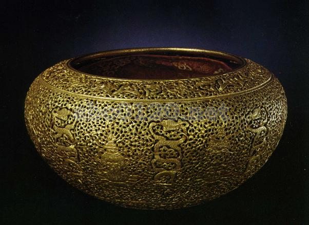 僧侶のつかう食器の形をした鉢を、梵語で鉢多羅という。鉄製透し彫りの器全体に鍍金をしており、細密な技法と優美な文様が鉢の総体をきわだたせている。底に「大清乾隆年製」の銘がある。出所:北京「故宮博物院展・紫禁城の宮廷芸術」1985-85