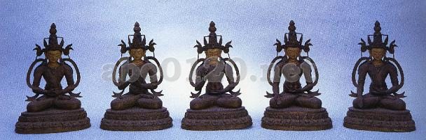 「菩提心論」のなかに説かれている五方佛をチベット式画像幅(タンカ)としている。各色の尊像は尊名と功徳をあらわす。