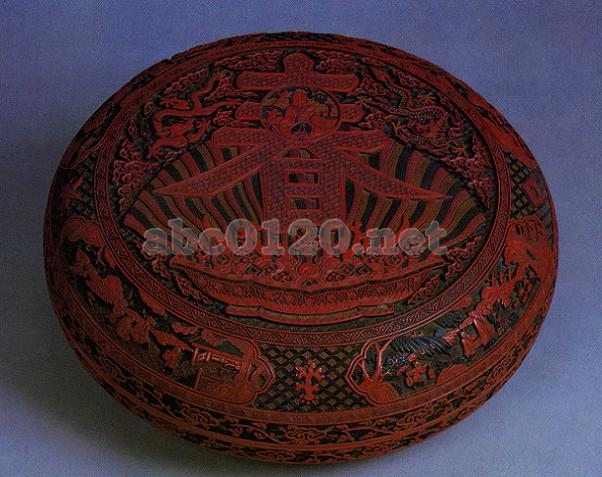 周囲には山水人物が彫られている。いずれも春の行楽をあらわす情景である。刀法は細かく入念で色漆も効果的に表現をたすけている。身裏には、「大清乾隆年製」の銘と「春寿宝盒」の器名が刻まれている。清代乾隆期に蘇州織造で製作されたもので、この時期の彫彩漆を代表する作品である。出所:北京「故宮博物院展・紫禁城の宮廷芸術」1985-85
